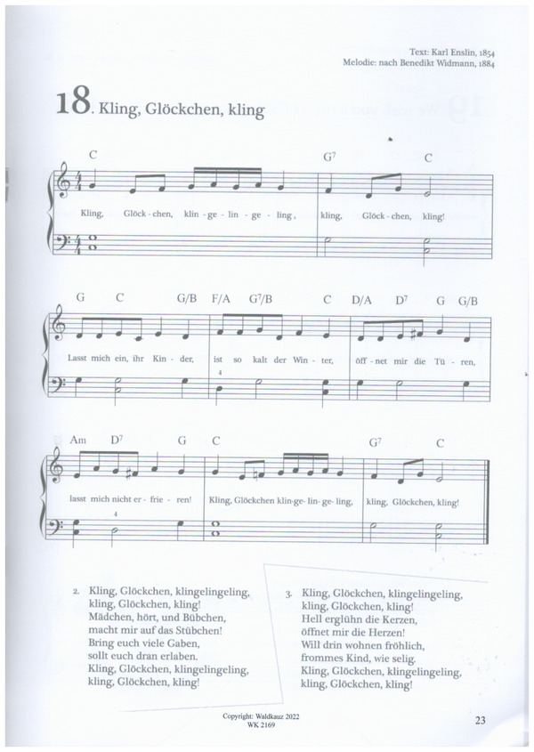 für Anfänger mit Erweiterungsmöglichkeiten Schneeflöckchen, Weißröckchen Jingle bells Was soll das bedeuten? O Tannenbaum Ihr Kinderlein kommet Laßt uns froh und munter sein Morgen kommt der Weihnachtsmann Wenn die erste Kerze brennt Stille Nacht, heilige Nacht Süßer die Glocken nie klingen Kommet, ihr Hirten Go, tell it on the mountain Lobt Gott, ihr Christen alle gleich Joy to the world Morgen, Kinder, wird's was geben Macht hoch die Tür Alle Jahre wieder Kling, Glöckchen, kling We wish you a merry Christmas Fröhliche Weihnacht überall Leise rieselt der Schnee Es ist ein Ros entsprungen Vom Himmel hoch da komm ich her O du fröhliche