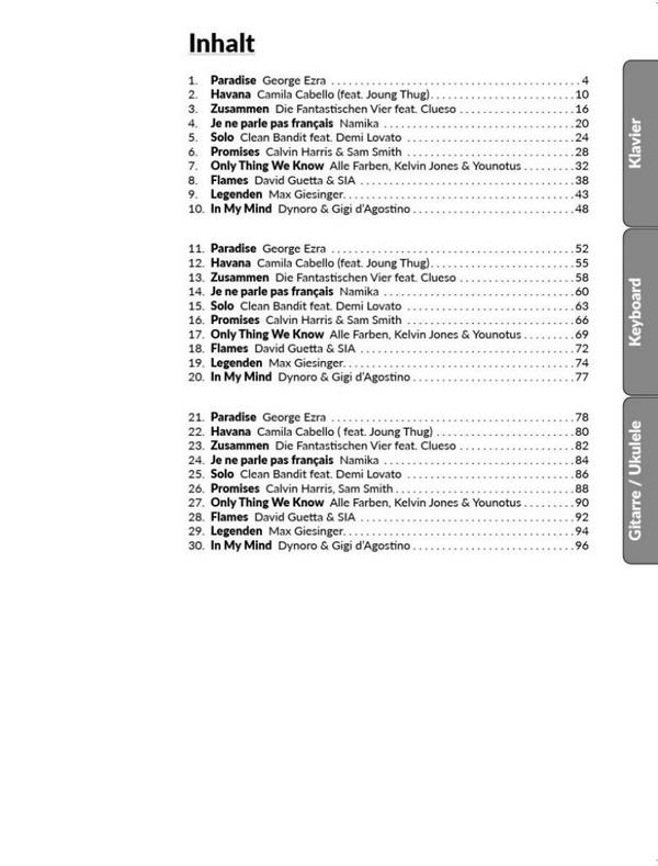 Jetzt alle 3 Monate das Beste aus den Charts! Die neue Reihe 10 Charthits enthält 10 der besten Hits der letzten 3 Monate für 4 Instrumente in einem Buch: Für Klavier gibt es alle Songs als Klavierarrangement in leichtem bis mittelschwerem Schwierigkeitsgrad arrangiert. Für Keyboard sind alle Songs mit Melodielinie, Texten und Akkorden notiert. Zudem gibt es zu jedem Song alle Akkorde in den richtigen Umkehrungen als übersichtliche Griffbilder. Für Gitarre und Ukulele gibt es Texte und Akkorde ohne Noten, dazu Vorschläge für einfache Schlagmuster und natürlich über jedem Song diepassenden Griffbilder. So hat man jeden Griff gleich parat. Jeder Song ist übersichtlich mit allen Formteilen (Strophe, Refrain etc.) gesetzt, so dass sich der Spieler schnell zurechtfindet und die Form nie aus den Augen verliert. Mit dem enthaltenen Scancode kommt man direkt zu der eigens für dieses Buch erstellten Playlist. Dort kann man alle Songs nochmal anhören oder auch dazu spielen. Paradise (George Ezra) Havana (Camila Cabello feat. Joung Thug) Zusammen (Die Fantastischen Vier feat. Clueso) Je ne parle pas français (Namika) Solo (Clean Bandit feat. Demi Lovato) Promises (Calvin Harris & Sam Smith) Only Thing We Know (Alle Farben, Kelvin Jones & Younotus) Flames (David Guetta & SIA) Legenden (Max Giesinger) In My Mind (Dynoro & Gigi d'Agostino)