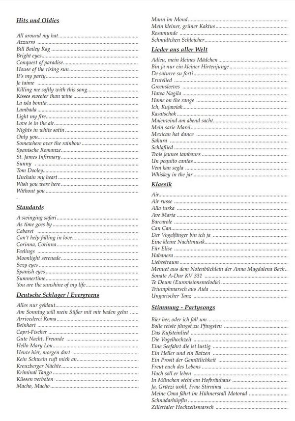 All Around My Hat Azzurro Bill Bailey Rag Billy Boy Bright Eyes Conquest Of Paradise House Of The Rising Sun It'S My Party Je T'Aime Killing Me Softly Kisses Sweeter Than Wine Lambada Light My Fire Love Is In The Air Nights In White Satin Only You Over The Rainbow Spanische Romanze St James Infirmary Sunny Tom Dooley Unchain My Heart Wish You Were Here Without You A Swingin' Safari Cabaret Can'T Help Falling In Love Corinna Corinna Das Kufsteiner Lied (Die Perle Tirols) Feelings La Paloma Moonlight Serenade Sexy Eyes Spanish Eyes You Are The Sunshine Of My Life Alles nur geklaut Am Sonntag will mein Süsser mit mir segeln gehn Arrividerci Roma Beinhart Capri Fischer Gute Nacht Freunde Hello Mary Lou Heute hier morgen dort Kein Schwein ruft mich an Kreuzberger Naechte Kriminal Tango Kuessen verboten Macho Macho Mann im Mond Mein kleiner gruener Kaktus Rosamunde Schmidtchen Schleicher Adieu mein kleines Maedchen Bin ja nur ein kleiner Hirtenjunge De Saturre Su Forti Erntelied Greensleeves Hava Nagila Home On The Range Ich Kujawiak Kasatschok Maienwind Am Abend Sacht Mein Sarie Marei Mexican Hat Dance Sakura Schlaflied Trois Jeunes Tambours Un Poquito Cantas Vem Kan Segla Foerutan Vind Whiskey In The Jar Air Air Russe Alla Turca Ave Maria Barcarole Can Can Der Vogelfaenger bin ich ja (Aus Die Zauberfloete) Eine kleine Nachtmusik KV525 Fuer Elise Habanera Liebestraum Menuett aus dem Notenbuechlein Fuer Anna Magdalena Bach Sonate A-Dur KV 331 (300i) Te Deum Triumphmarsch ( Aida) Ungarischer Tanz Bier her oder ich fall um Bolle reiste jüngst zu Pfingsten Die Vogelhochzeit Eine Seefahrt die ist lustig Ein Heller und ein Batzen Ein Prosit der Gemuetlichkeit Freut euch des Lebens Hoch soll er leben Holladaratata wer ko der ko In Muenchen steht ein Hofbraeuhaus Ja Gruezi wohl Frau Stirnima Meine Oma faehrt im Huehnerstall Motorrad Schnadahuepfln Zillertaler Hochzeitsmarsch