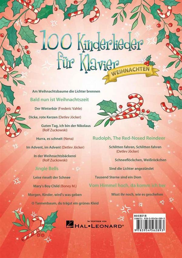 Im dritten Band der erfolgreichen Reihe 100 Kinderlieder für Klavier wurden die schönsten Weihnachtslieder speziell für Kinder gesammelt. Es gibt zudem Ausgaben in drei weiteren Instrumentierungen - für Gitarre, für Ukulele und für Keyboard. Traditionelle Weihnachtslieder für die ganze Familie, Weihnachtsklassiker von Rolf Zuckowski, Detlev Jöcker oder Frederic Vahle sind ebenso vertreten wie Popsongs wie Marys Boy Child von Boney M. oder Hurra, es schneit von Nena. Auch mit dabei sind viele beliebte Lieder aus der ehemaligen DDR, wie z.B. Oh, es riecht gut, Vorfreude, schönste Freude oder Tausend Sterne sind ein Dom. Die Sammlung eignet sich wunderbar für den Kindergarten, die Grundschule oder für das gemeinsame Singen und Musizieren zu Hause. Die Spiralbindung erleichtert das Umblättern der Seiten, Griffbilder und eine großzügige Notenaufteilung vereinfachen das Lernen und Spielen der Lieder. A, a, a, das Kindlein lieget da A Child This Day Is Born Advent, Advent ein Lichtlein brennt Alle fangt an, wer singen kann Alle Jahre wieder Am Weihnachtsbaume die Lichter brennen Auf dem Berge, da wehet der Wind Auf, auf doch, ihr Kinder Away In A Manger Backen für den Weihnachtsmann Bajushki Baju Bald ist Nikolausabend da Bald nun ist Weihnachtszeit Bastellied Bimmelt was die Straß entlang Das Rackedickeducke-Lied Deck The Hall Der Christbaum ist der schönste Baum Der Schneemann auf der Straße Der Winter ist gekommen Der Winterbär Dicke, rote Kerzen Die Nacht vor dem Heiligen Abend Die Weihnachtszeit kommt nun heran Eine Muh, eine Mäh Es ist Dezember Es ist für uns eine Zeit angekommen Es schneit Es stand ein Stern am Himmel Es wird schon gleich dunkel Feliz Navidad Frau Holle Fröhliche Weihnacht (macht euch bereit) Fröhliche Weihnacht überall Go, Tell It On The Mountain God Rest You, Merry Gentlemen Guten Abend, schön Abend Guten Tag, ich bin der Nikolaus Hört der Engel helle Lieder Hört doch in den Stuben Hurra, es schneit Ich lag und schlief Ihr Kinderlein kommet Im Advent, im Advent Im Walde steht ein Tannenbaum In der Weihnachtsbäckerei In einem kleinen Apfel Inmitten der Nacht Jauchzet ihr Himmel, frohlocket ihr Engel Jingle Bells Joseph, lieber Joseph mein Kling, Glöckchen, klingelingeling Knecht Ruprecht aus dem Walde kam Kommet, ihr Hirten Lasst uns das Kindlein wiegen Leise rieselt der Schnee Lieber, guter Nikolaus Little Drummer Boy Macht hoch die Tür Mary's Boy Child Mit den Hirten will ich gehen Morgen Kinder, wirds was geben Morgen kommt der Nikolaus Morgen kommt der Weihnachtsmann/Ah! Vous dirai-je, Maman (W.A. Mozart) Niklaus, Niklaus guter Mann Nun singet und seid froh O du fröhliche O freudenreicher Tag O Tannenbaum O Tannenbaum, du trägst ein grünes Kleid Oh, es riecht gut Rudolph, The Red-Nosed Reindeer Ruprecht, Ruprecht lieber Mann Sankt Niklaus, komm in unser Haus Schlitten fahren, Schlitten fahren Schneeflöckchen, Weißröckchen Schneemann baun und Schneeballschlacht Sei gegrüßt, lieber Nikolaus Sind die Lichter angezündet So viel Heimlichkeit Stern über Betlehem Still, Still, Still, weils Kindlein schlafen will Stille, stille, kein Geräusch gemacht Süßer die Glocken nie klingen Tausend Sterne sind ein Dom Vom Himmel hoch, da komm ich her Vorfreude, schönste Freude We Wish you A Merry Christmas Weißer Winter Wenn Weihnachten ist Wer klopfet an Wi, Wa, Weihnachtsmaus Winterkinder Winterwunderland (Winter Wonderland) Winterzeit - Weihnachtszeit Wir sagen euch an den lieben Advent Wir wollen ein Liedelein singen Wisst ihr noch, wie es geschehen Wo wohnt der Weihnachtsmann Zu Bethlehem geboren