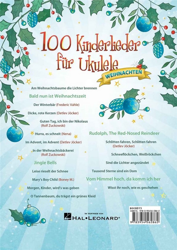 Im dritten Band der erfolgreichen Reihe 100 Kinderlieder für Ukulele wurden die schönsten Weihnachtslieder speziell für Kinder gesammelt. Es gibt zudem Ausgaben in drei weiteren Instrumentierungen - für Gitarre, für Klavier und für Keyboard. Traditionelle Weihnachtslieder für die ganze Familie, Weihnachtsklassiker von Rolf Zuckowski, Detlev Jöcker oder Frederic Vahle sind ebenso vertreten wie Popsongs wie Marys Boy Child von Boney M. oder Hurra, es schneit von Nena. Auch mit dabei sind viele beliebte Lieder aus der ehemaligen DDR, wie z.B. Oh, es riecht gut, Vorfreude, schönste Freude oder Tausend Sterne sind ein Dom. Die Sammlung eignet sich wunderbar für den Kindergarten, die Grundschule oder für das gemeinsame Singen und Musizieren zu Hause. Die Spiralbindung erleichtert das Umblättern der Seiten, Griffbilder und eine großzügige Notenaufteilung vereinfachen das Lernen und Spielen der Lieder. A Child This Day Is Born A, a, a, das Kindlein lieget da Advent, Advent ein Lichtlein brennt Alle fangt an, wer singen kann Alle Jahre wieder Am Weihnachtsbaume die Lichter brennen Auf dem Berge, da wehet der Wind Auf, auf doch, ihr Kinder Away In A Manger Backen für den Weihnachtsmann Bajushki Baju Bald ist Nikolausabend da Bald nun ist Weihnachtszeit Bastellied Bimmelt was die Straß entlang Das Rackedickeducke-Lied Deck The Hall Der Christbaum ist der schönste Baum Der Schneemann auf der Straße Der Winter ist gekommen Der Winterbär Dicke, rote Kerzen Die Nacht vor dem Heiligen Abend Die Weihnachtszeit kommt nun heran Eine Muh, eine Mäh Es ist Dezember Es ist für uns eine Zeit angekommen Es schneit Es stand ein Stern am Himmel Es wird schon gleich dunkel Feliz Navidad Frau Holle Fröhliche Weihnacht (macht euch bereit) Fröhliche Weihnacht überall Go, Tell It On The Mountain God Rest You, Merry Gentlemen Guten Abend, schön Abend Guten Tag, ich bin der Nikolaus Hört der Engel helle Lieder Hört doch in den Stuben Hurra, es schneit Ich lag und schlief Ihr Kinderlein kommet Im Advent, im Advent Im Walde steht ein Tannenbaum In der Weihnachtsbäckerei In einem kleinen Apfel Inmitten der Nacht Jauchzet ihr Himmel, frohlocket ihr Engel Jingle Bells Joseph, lieber Joseph mein Kling, Glöckchen, klingelingeling Knecht Ruprecht aus dem Walde kam Kommet, ihr Hirten Lasst uns das Kindlein wiegen Leise rieselt der Schnee Lieber, guter Nikolaus Little Drummer Boy Macht hoch die Tür Mary's Boy Child Mit den Hirten will ich gehen Morgen Kinder, wirds was geben Morgen kommt der Nikolaus Morgen kommt der Weihnachtsmann/Ah! Vous dirai-je, Maman (W.A. Mozart) Niklaus, Niklaus guter Mann Nun singet und seid froh O du fröhliche O freudenreicher Tag O Tannenbaum O Tannenbaum, du trägst ein grünes Kleid Oh, es riecht gut Rudolph, The Red-Nosed Reindeer Ruprecht, Ruprecht lieber Mann Sankt Niklaus, komm in unser Haus Schlitten fahren, Schlitten fahren Schneeflöckchen, Weißröckchen Schneemann baun und Schneeballschlacht Sei gegrüßt, lieber Nikolaus Sind die Lichter angezündet So viel Heimlichkeit Stern über Betlehem Still, Still, Still, weils Kindlein schlafen will Stille, stille, kein Geräusch gemacht Süßer die Glocken nie klingen Tausend Sterne sind ein Dom Vom Himmel hoch, da komm ich her Vorfreude, schönste Freude We Wish you A Merry Christmas Weißer Winter Wenn Weihnachten ist Wer klopfet an Wi, Wa, Weihnachtsmaus Winterkinder Winterwunderland (Winter Wonderland) Winterzeit - Weihnachtszeit Wir sagen euch an den lieben Advent Wir wollen ein Liedelein singen Wisst ihr noch, wie es geschehen Wo wohnt der Weihnachtsmann Zu Bethlehem geboren
