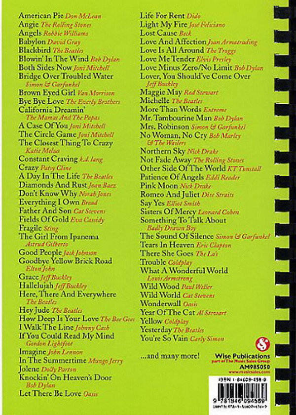American Pie Angie Angels Babylon Blackbird Blowin' in the Wind Both Sides now Bridge over troubled Water Brown eyed Girl Bye bye Love California Dreamin' A Case of You The Circle Game The closest Thing to crazy Constant Craving Crazy A Day in the Life Diamonds and Rust Don't know why Everything I own Father and Son Fields of Gold Fragile The Girl from Ipanema Good People Goodbye yellow Brick Road Grace Hallelujah Here there and everywhere Hey Jude How deep is your Love I walk the Line If You could read my Mind Imagine In the Summertime Jolene Knockin' on Heaven's Door Let there be Love Life for Rent Light my Fire Lost Cause Love and Affection Love is all around Love me tender Love minus Zero/No Limit Lover You should 've come over Maggie May Michelle More than Words Mr. Tambourine Man Mrs. Robinson No Woman no Cry Northern Sky Not fade away Other Side of the World Patience of Angels Pink Moon Rome and Juliet Say Yes Sisters of Mercy Something to talk about The Sound of Silence Tears in Heaven There she goes Trouble What a wonderful World Wild Wood Wild World Wonderwall Year of the Cat Yellow Yesterday You're so vain