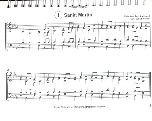 Pfortner, Alfred, arr. Sankt Martin Ich geh mit meiner Laterne Laterne Laterne Durch die Straßen Abends wenn es dunkel wird Da draußen weht der Wind so kalt Lasst uns froh und munter sein Licht in der Laterne Tragt in die Welt nun ein Licht Martin ist ein frommer Mann Ich hab eine feine Laterne Der Mond ist aufgegangen