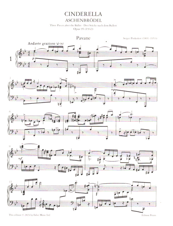 In the winter of 1940, Prokofiev sat down with the librettist Nikolai Volkov to sketch a new ballet. One year later, the first two acts of the renowned fairy tale Cinderella were finalized, based on the literary work by Charles Perrault. As in the case of Romeo and Juliet, Prokofiev published independent piano versions before the premiere of the main work, which in the case of Cinderella primarily served to utilize the pieces that had already been composed. While the Three Pieces Op. 95 from 1942 refer to Cinderella herself, the Ten Pieces Op. 97 from 1943 consist of character dances for other figures in the ballet. The composer wrote an arrangement of the final Adagio for cello and piano (Op. 97b). In 1944 he added a further Six Pieces Op. 102 for piano, three orchestral suites followed in 1946 (Opp. 107, 108, 109). Im Winter 1940, setzte sich Prokofjew mit dem Librettisten Nikolaj Wolkow zu Skizzen für ein neues Ballett zusammen. Ein Jahr später waren die ersten beiden Akte zum international bekannten Sujet von Aschenbrödel auf Basis der Literaturvorlage von Charles Perrault fertig konzipiert. Wie bereits im Fall von Romeo und Julia veröffentlichte Prokofjew schon vor der Uraufführung des Hauptwerkes eigenständige Klavierfassungen, was bei Aschenbrödel vor allem dazu diente, die bereits komponierten Stücke zu verwerten. Während sich die Drei Stücke op. 95 von 1942 auf Aschenbrödel selbst beziehen, bestehen die Zehn Stücke op. 97 von 1943 aus Charaktertänzen für andere Figuren. Aus dem abschließenden Adagio verfasste der Komponist eine Bearbeitung für Violoncello und Klavier (op. 97b). Für Klavier ergänzte er 1944 weitere Sechs Stücke op. 102, 1946 folgten drei Orchestersuiten (op. 107, 108, 109).