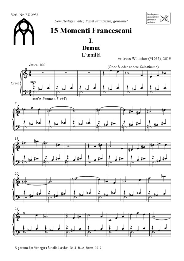 Orgelwerke Band 10 Demut Die Krippe in Greccio De Mantel mit den Sternen Die heilige Armut Die Vogelpredigt Bruder Wolf Lied der Blumen Bruder Masseo Der Weinberg Bruder Bernardo Der Engel mit der Violine Bruder Giovanni Franziskus gebietet den Schwalben Ruhe Die heilige Klara segnet das Brot Bruder Rufino