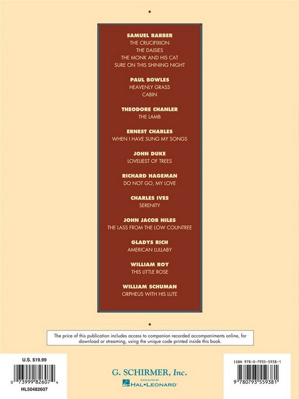 Sure on the Shining Night The Daisies The Crucifixion The Monk and his Cat Cabin Heavenly Grass The Lamb When I have sung my Songs Loveliest of Trees Do not go, my Love Serenity The Lass from the low Countree American Lullaby This little Rose Orpheus with his Lute