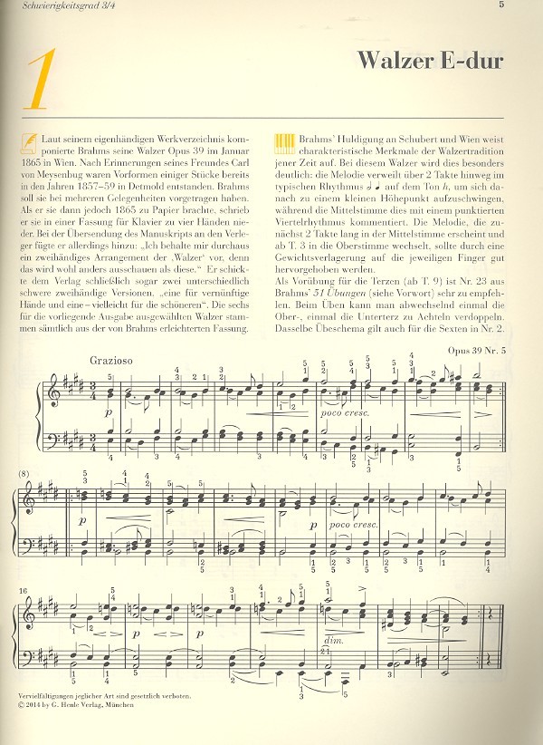 Reihe Am Klavier Hewig-Tröscher, Sylvia, ed und Fingersatz Walzer E-Dur op.39,5 Walzer B-Dur op.39,8 Walzer d-Moll op.39,9 Walzer G-Dur op.39,10 Walzer h-Moll op.39,11 Walzer A-Dur op.39,15 Intermezzo E-Dur op.116,6 Intermezzo a-Moll op.76,7 Intermezzo Es-Dur op.117,1 Intermezzo B-Dur op.76,4 Ballade d-Moll op.10,1 Rhapsodie g-Moll op.79,2 Romanze F-Dur op.118,5 Intermezzo D-Dur op.119,3 Ballade g-Moll op.118,3