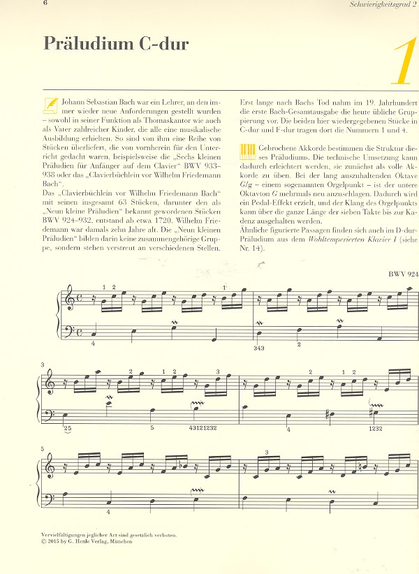 Reihe 'Am Klavier' Hewig-Tröscher, Sylvia, ed und Fingersatz Kleines Präludium aus dem Klavierbüchlein für W. Fr. Bach BWV 924 Kleines Präludium aus dem Klavierbüchlein für W. Fr. Bach BWV 927 Kleines Präludium für Anfänger auf dem Klavier BWV 936 Choral: Wer nur den lieben Gott läßt walten BWV 691 Invention 6 E-dur BWV 777 Invention 3 D-dur BWV 774 Capriccio sopra la lontananza B-dur BWV 992 Aria BWV 988 Sinfonie 6 E-dur BWV 792 Sinfonie 8 F-dur BWV 794 Menuet (aus: Französische Suite h-moll) BWV 814 Allemande, Sarabande, Gigue (aus: Französische Suite Es-dur) BWV 815 Präludium und Fuge Fis-dur BWV 858 Präludium und Fuge D-dur BWV 850 Präludium und Fuge c-moll BWV 871 Präludium und Fuge h-moll BWV 893