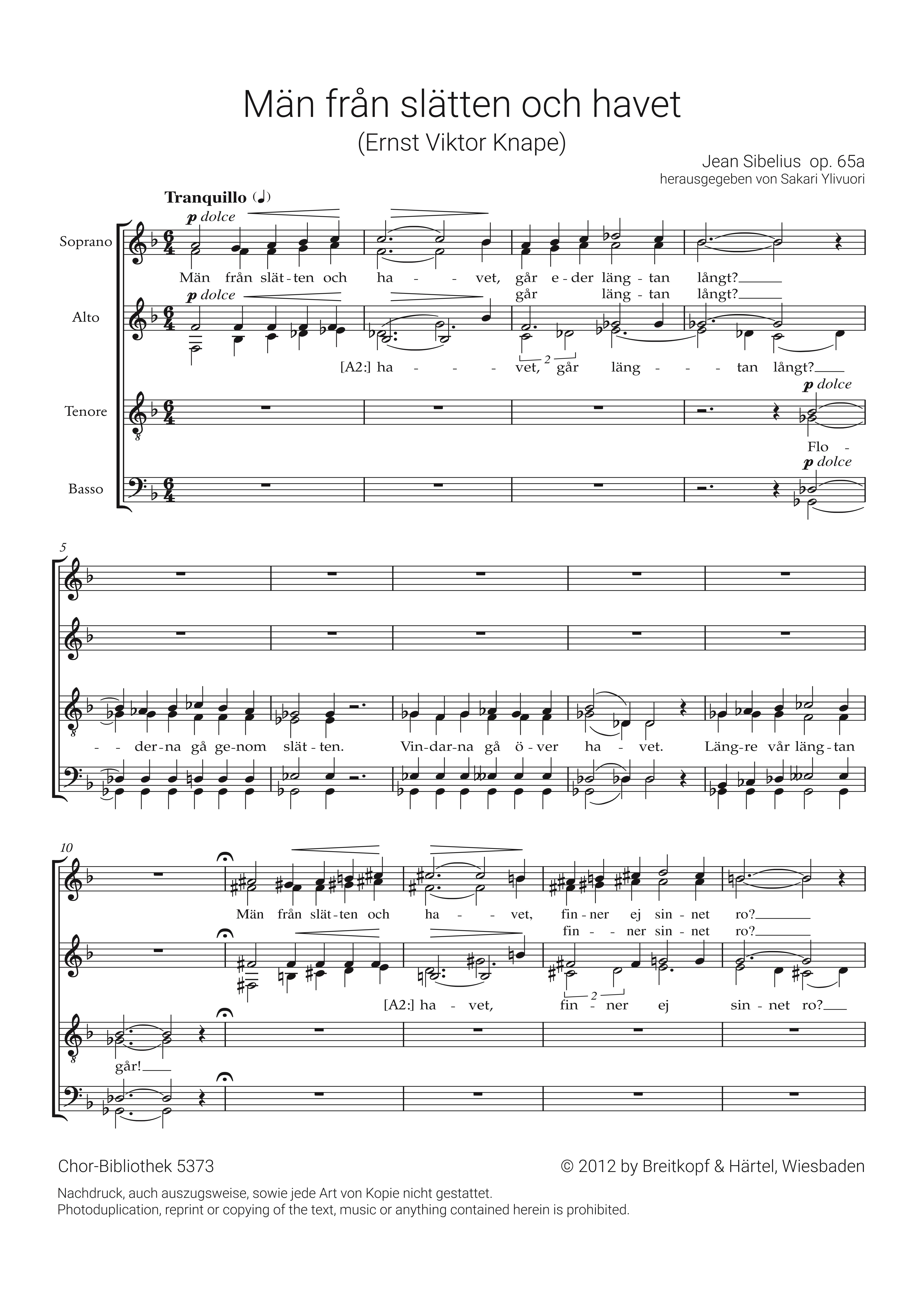 Ylivuori, Sakari, ed Die zwei Chöre in Jean Sibelius op. 65 unterscheiden sich sowohl durch die verschiedenen Sprachen, Schwedisch und Finnisch, als auch durch ihre Konzeptionen. Män från slätten och havet op. 65a war ein Kompositionsauftrag des Musikausschusses der Svenska Folkskolans Vänner, einer schwedischsprachigen Bildungsorganisation, die im Juni 1912 in Vaasa ein Gesangsfest veranstaltete. Die Uraufführung fand im Abschlusskonzert des Festivals mit insgesamt etwa 1300 Sängern statt, allerdings musste eine Streicherbegleitung eingesetzt werden, um das relativ anspruchsvolle polyphone Stück aufführen zu können. Das wesentlich einfacher angelegte Kallion kirkon kellosävel op. 65b war ursprünglich von Sibelius als Melodie für das Glockenspiel einer neu gebauten Kirche im Bezirk Kallio in Helsinki komponiert worden. In Berichten zur Einweihung der Kirche im September 1912 wurde jedoch der Chordirigent Heikki Klemetti als Komponist genannt. Sibelius sah sich daraufhin genötigt, Bearbeitungen für Klavier solo und für gemischten Chor a cappella zu schreiben und zu veröffentlichen. Klemetti verfasste für letztere schließlich einen neuen Text. Die aktuelle Ausgabe enthält sowohl Übersetzungen der Texte in Deutsch und Englisch als auch ein informatives Vorwort, das ebenso wie die Noten auf der Gesamtausgabe Jean Sibelius Werke beruht. Op.65a Män från slätten och havet (Ernst Viktor Knape) Op.65b Kallion kirkon kellosävel (Heikki Klemetti)