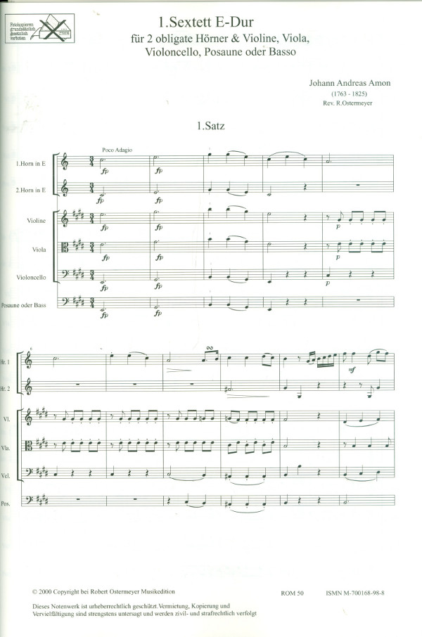 | Untertitel: | für 2 Hörner, Violine, Viola, Violoncello und Posaune (Bass) Partitur und Stimmen |