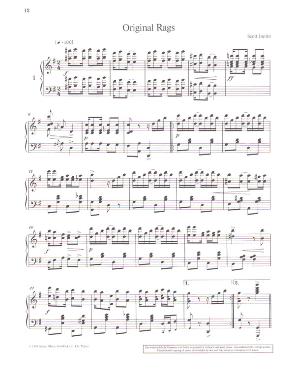 Zu den zeitlosen Klassikern und Standardwerken im Klavierunterricht zählen zweifelsohne die Werke des wohl erfolgreichsten Ragtime-Komponisten Scott Joplin. Dieser Band der Reihe 'Schott Piano Classics' enthält eine sorgfältig ausgewählte Zusammenstellung seiner 20 bekanntesten Ragtimes in der Originalfassung. Zusätzlich enthält das Heft eine von Joplin selbstverfasste 'School of Ragtime', in der die Stilistik und besondere Spielweisen des Ragtime erläutert und mit spielpraktischen Übungen veranschaulicht werden. Original Rags Maple Leaf Rag Peacherine Rag The Easy Winners Elite Syncopations The Entertainer Weeping Willow Palm Leaf Rag The Favorite The Chrysanthemum The Cascades The Ragtime Dance Rose Leaf Rag Pine Apple Rag Paragon Rag Wall Street Rag Country Club Euphonic Sounds Scott Joplin's New Rag Reflection Rag