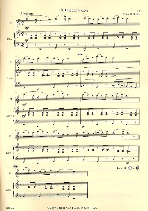 Aria Spiritual Portsmouth Thema aus Rosamunde November Kindermarsch Auld lang syne Amazing Grace Con Spirito Augustin Rock Schumannesque Lied ohne Worte Gebet Menuett Volkslied Zirkuswalzer Enten-parade Puppenwalzer Petes Blues Abendlied Dieses Album enthält eine abwechslungsreiche Sammlung von Konzertstücken für Anfängerflötisten mit einfachen Klavierbegleitungen, die bereits jungen Pianisten die Möglichkeit für erste kammermusikalische Erfahrungen geben. Da sowohl die musikalischen Voraussetzungen als auch die Entwicklung jedes Flötisten auf seinem Instrument oft sehr unterschiedlich sind, ist die Reihenfolge der Stücke bewusst nicht chronologisch angelegt.