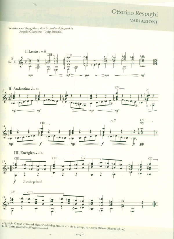 Guitar Library Zigante, Frédéric, arr. Variazioni (Respighi) Aranci in fiore - Tarantella - Capriccio Diabolico (Castelnuovo Tedesco) Studio da concerto (Ghedini) Preludio (Malipiero) Omaggio a Manuel de Falla (Margola) Cinque Preludi (Bettinelli) Suoni notturni (Petrassi)