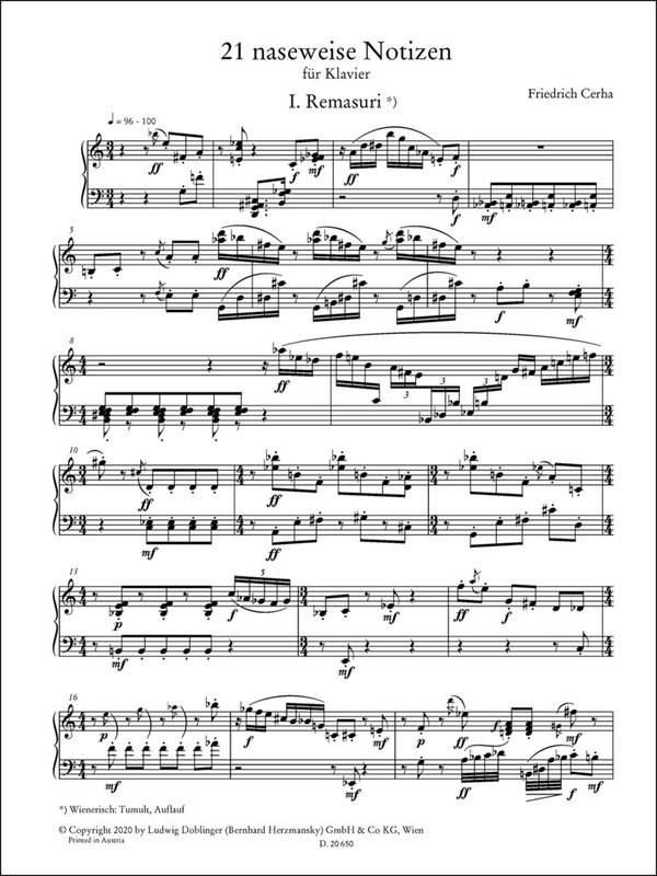 21 kurze Kompositionen mit teilweise launig-humorvollen Titelüberschriften sowohl einzeln als auch als Zyklus aufführbar. Remasuri Nixen Aufbrausen und Beruhigung Vor sich hinbrüten Ballawatsch Abendsinieren Puschkawüh Müde vom Meditieren Nicht weiterkönnen Schlaflied Poltergeister Sommerabendluft Die spitzfindige Tante Bahö Der Blick in den nächtlichen Himmel Das bakschierliche Tschapperl und der Bodschochter Raserei Und die ganze Meschpoche applaudiert Schlichter Abschied Wie sich der kleine Moritz die große Welt vorstellt Mia san mia