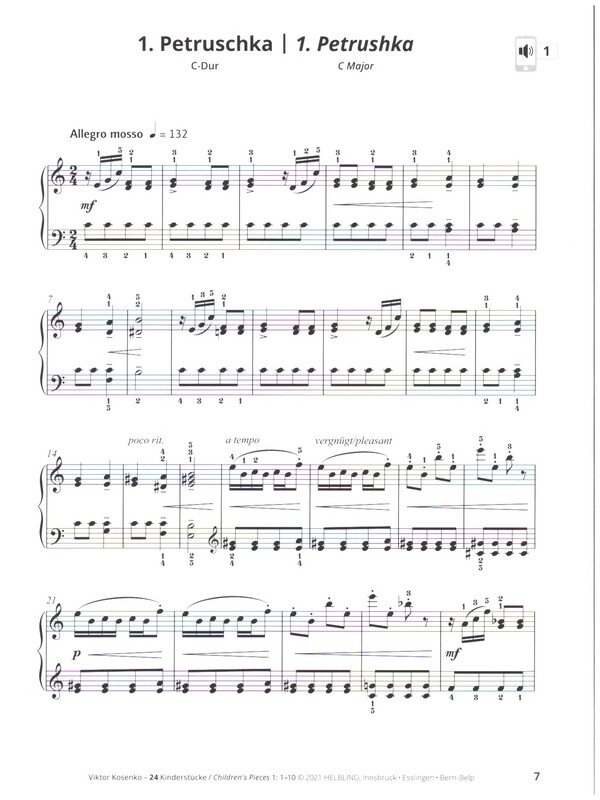 24 Children's Pieces In seinem Heimatland Ukraine gilt Viktor Kosenko (18961938) zu Recht als einer der wichtigsten Wegbereiter der nationalen Klavierschule in der ersten Hälfte des 20. Jahrhunderts. So sind seine Klavierstücke in der schulischen und universitären Ausbildung nicht mehr wegzudenken. Kosenkos individuell geprägter Kompositionsstil ist grundsätzlich der Dur-/Moll-Tonalität verpflichtet. Er verknüpft Spätromantik und Moderne auf originelle Weise. Oft wird Kosenko auch dem Neoklassizismus zugerechnet. Obwohl ihm nur 42 Lebensjahre vergönnt waren, umfasst Viktor Kosenkos uvre rund 250 Kompositionen, darunter etwa 100 Klavierwerke. Die 24 Kinderstücke zählen zum Standardrepertoire der osteuropäischen Klavierausbildung und liegen hier erstmals außerhalb der Ukraine als übersichtliche Gesamtausgabe in drei Einzelbänden vor. Sie stehen in der Tradition bekannter klavierpädagogischer Werke des 19. Jahrhunderts, wie Robert Schumanns Album für die Jugend oder Pjotr Iljitsch Tschaikowskys Kinderalbum. Der pianistische Anspruch steigt schrittweise. Mit spieltechnischen Anforderungen wie beispielsweise ein klarer Unterschied zwischen Legato und Staccato, eine getragene pianistische Kantilene, Sprünge, Dreiklangsbrechungen oder Skalen werden Kinder und Jugendliche gekonnt und musikalisch ausgesprochen attraktiv vertraut gemacht. Inhaltlich setzt sich Kosenko mit ähnlichen Themenkreisen wie Schumann und Tschajkowsky auseinander. Lieder und Tänze aus der ukrainischen Volksmusik und anderen Regionen, Naturbilder, Figuren und Spiele aus dem kindlichen und jugendlichen Alltag sowie entsprechende Gefühlsregungen und unterschiedliche Stimmungen prägen diese effektvollen Stücke. Nach dem Quintenzirkel geordnet, durchlaufen die in Satztechnik und Ausdruck abwechslungsreich komponierten Spielstücke alle Dur- und Moll-Tonarten. Petruschka Dem Schmetterling hinterher Marschlied Ukrainisches Volkslied Am Waldrand Walzer Morgens im Garten Enttäuschung Mein Teddybär Polka