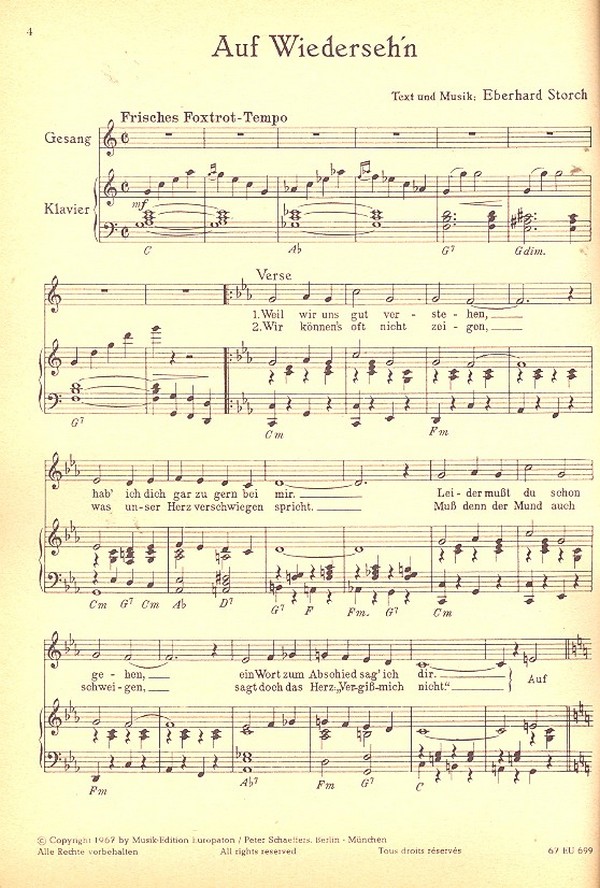 Auf Wiedersehn - Außer Spesen nichts gewesen - Du kannst du was, da hast du was - das kann morgen vorbei sein - Die Sterne von Syrakus - Du bist Wunderbar - Du musst alles vergessen = Ay Ay Ay Amigo Du mußt die Männer schlecht behandeln Durst ist schlimmer als Heimweh - Egon - Ein Wunder ist heut' für mich geschehn - Herz Schmerz und dies und das - Ich bin bald wieder hier - Ich danke dir - Ich hab' mich so an dich gewöhnt- Ich schau den weißen Wolken nach - Illusionen - In der Taverne von Santa Marie - Irgenwann gibts ein Wiedersehn - Istanbul - Maria Dolores - Mariandl - Paradies -Foxtrott - Schwarzer Panther - Seit heut bin ich verliebt - Sie will nicht Blumen und nicht Schokolade - Weiße Möwe, Flieg in die Ferne Wenn wir heut' auseinandergehen - wo ist der Eine -