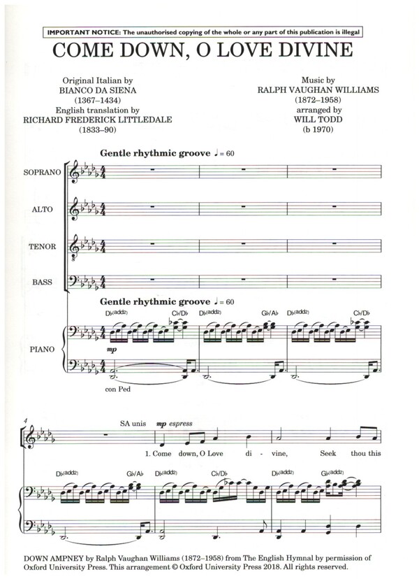 Contemporary Choral Series Rowlands, William Penfro, Koautor Todd, Will, ed Vaughan Williams/Tood: Come down, O Love Divine (Down Ampney) Rowlands/Todd: God is Love / Love Divine (Blaenwern) French Traditional/Todd: Let all mortal flesh keep silence (Picardy)