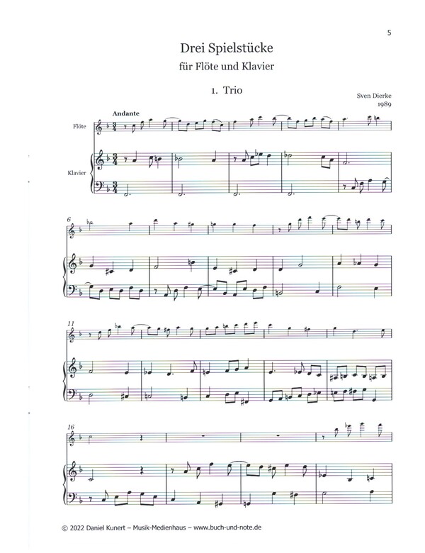 Trio Tagtraum *** Basierend auf kurzen Intermezzi für Tasteninstrumente entstanden diese drei 'Spielstücke' für Klavier und Querflöte im Jahr 1989 aus der Aufgabe, aus klassischen Formen heraus Neues entstehen zu lassen. So verbinden die drei Stücke - 2019 überarbeitet und uraufgeführt - eine romantischen Grundidee mit rhytmischen und harmonischen Formen des 20. Jahrhunderts.