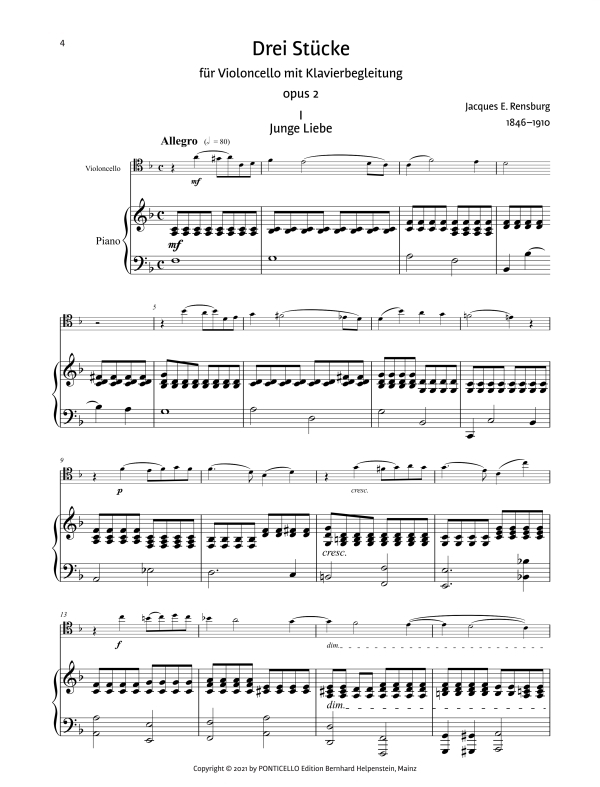 Junge Liebe Bangen Beruhigung Jacques Eduard Rensburg wurde am 21. Mai 1846 in Rotterdam als drittes Kind des Bankiers Eduard Hartog Rensburg und seiner Ehefrau Flora van Wilsen geboren. Ab dem neunten Lebensjahr wurde er am Violoncello ausgebildet. Zu seinen Lehrern zählten Simon Ganz, Fritz Giese, Daniel de Lange, Emil Hegar und Woldemar Bargiel, der Schwager von Robert Schumann. 1867 übersiedelte er nach Köln um seine Studien bei Alexander Schmit, dem ersten Cellisten des Gürzenich-Orchesters, fortzusetzen. Dieser war allerdings schwer lungenkrank und konnte ihn nicht mehr unterrichten. Rensburg übernahm wenige Monate nach Schmits Tod (24.10.1867) dessen Nachfolge im Orchester und im Cölner Quartett, kurze Zeit später auch die als Lehrer an der Rheinischen Musikschule. 1869 heiratete er Julie Levie (1836-1906), eine Nichte Jacques Offenbachs. Aus gesundheitlichen Gründen zog er sich 1874 mit seiner Familie nach Rotterdam zurück und arbeitete wieder als Bankier. 1880 wechselte er nach Bonn und nahm dort aktiv am Musikleben teil. Er führte ein offenes Haus und empfing u.a. Joseph Joachim, Pablo de Sarasate, Johannes Brahms, Max Bruch und Elly Ney als Gäste. 1894 wurde ihm vom preußischen Kultusministerium der Professoren-Titel verliehen. Er starb am 22. Dezember 1910 und wurde am 25. Dezember unter Anteilnahme einer großen Trauergemeinde zu Grabe getragen. Als Grundlage für die Neuausgabe der Drei Stücke op. 2 diente der Ende 1889 oder Anfang 1890 bei Gustav Cohen in Bonn erschienene Erstdruck. Die Notation wurde der heute üblichen angeglichen, wenige Fehler wurden stillschweigend korrigiert. Dank gebührt der Urenkelin des Komponisten, Frau Ille Schulte-Willekes, die sich für die Wiederbelebung seines Schaffens einsetzt und den Verleger auf sein OEuvre aufmerksam gemacht hat. Eine Bratschen-Fassung erscheint im Musikverlag ViolaViva (Bestellnummer VV 217 - ISMN 979-0-50274-217-1), die Einrichtung der Bratschenstimme besorgte Wolfgang Birtel.