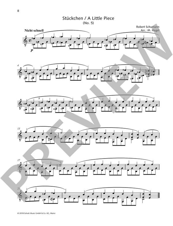 Hegel, Martin, arr. 8 Stücke aus dem 'Album für die Jugend' op.68: Melodie (No.1) Soldatenmarsch (No.2) Trällerliedchen (No.3) Stückchen (No.5) - Armes Waisenkind (No.6) Kleine Studie (No.14) Erster Verlust (No.16) Mignon (No.35) 4 Stücke aus 'Albumblätter' op.124: Walzer (No.4) Phantasietanz (No.5) Wiegenliedchen (No.6) Larghetto (No.13) 7 Stücke aus den 'Kinderszenen' op.15: Von fremden Ländern und Menschen (No.1) Kuriose Geschichte (No.2) Bittendes Kind (No.4) Ritter vom Steckenpferd (No.9) Fürchtenmachen (No.11) Kind im Einschlummern (No.12) Der Dichter spricht (No.13) 7 Schumann-Transkriptionen von Francisco Tárrega (1852 - 1909): Andantino Cantabile (No.4 aus op.99) Preludio (No.5 aus op.99) Romanza (No.1, Trio aus op.21) Rêverie ('Träumerei' aus op.15) Feuilles variées (No.5 aus op.99) Berceuse ('Schlummerlied', No.16 aus op.124) Saint Nicolas ('Knecht Ruprecht' aus op.68) 4 Lied-Bearbeitungen für Gitarrenduo: Mondnacht (No.5 aus op.39) Im wunderschönen Monat Mai (No.1 aus op.48) Die Lotosblume (No.7 aus op.25) Er, der Herrlichste von Allen (No.2 aus op.42)