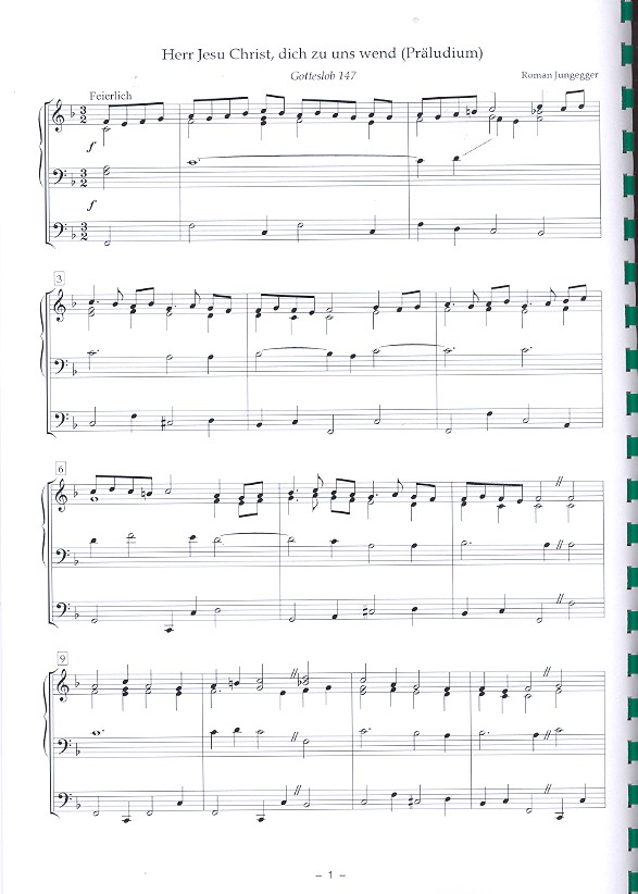 Fischers Musik-Bibliothek Jungegger, Roman, bearb. Alles meinem Gott zu Ehren Beim letzten Abendmahle (Christus der ist mein Leben) Das ist der Tag den Gott gemacht Der Geist des Herrn erfüllt das All Ehre sei Gott in der Höhe Ein Haus voll Glorie schauet Erde singe dass es klinge Es ist ein Ros entsprungen Großer Gott wir loben dich Halleluja Herr Jesu Christ dich zu uns wend Herr dir ist nichts verborgen Ich will dich lieben meine Stärke Ihr Freunde Gottes allzugleich Komm o komm du Tröster mein Komm Schöpfer Geist kehr bei uns ein Lobe den Herren (Jauchzet ihr Himmel) Macht hoch die Tür Nun danket all und bringet Ehr (Nun singe Lob du Christenheit) Nun danket alle Gott Nun freut euch ihr Christen O du fröhliche O Jesu Christe wahres licht O Welt ich muss dich lassen Schönster Herr Jesu Herrscher aller Herren Singt dem König Freudenpsalmen Stille Nacht Was Gott tu das ist wohlgetan Wir weihn der Erde Gaben dir Zu Bethlehem geboren