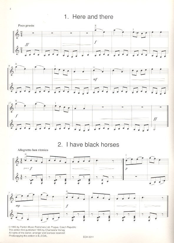 The EGTA Series 33 tschechische Folksongs 33 tschechische Volkslieder Here and there I have black Horses Oh, Love, Love Hey-ho, Geese Here comes the Postman The Girl with the blue Eyes It's raining, it's raining, it's pouring Look after me, Mother dear Andulichko, Hello Batchelar, Peter, ed