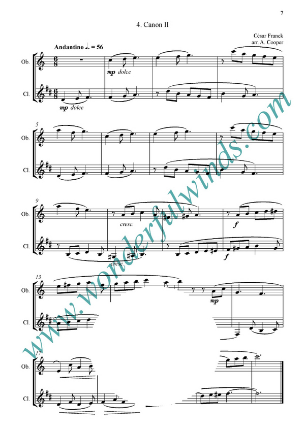 1. Les Plaintes d'une Poupée 2. (untitled) 3. Chant de la Creuse 4. Canon II These charming short pieces are taken from two books of pieces 19th century Belgian composer César Franck wrote for the harmonium (an instrument similar to an organ, where the sound is produced as air passes through metal reeds, usually powered by foot-operated bellows). They were written for a pupil, a village organist, to illustrate technical advice. The first piece (Dolly's Complaint) is the longest of the set, with the middle section wandering into the minor key, the second (untitled) features chormatic lines and litling, shared melodies. The third is a Song from the Creuse (an area of central France), and has a rustic feel with the time changing from 2 to 3 beats in a bar. The last piece is a simple canon in compound time.