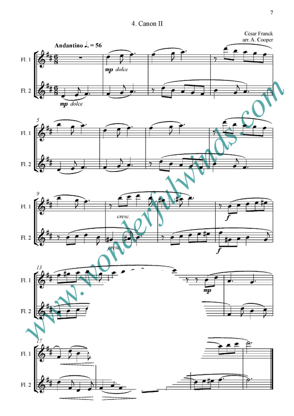 1. Les Plaintes d'une Poupée 2. (untitled) 3. Chant de la Creuse 4. Canon II These charming short pieces are taken from two books of pieces 19th century Belgian composer César Franck wrote for the harmonium (an instrument similar to an organ, where the sound is produced as air passes through metal reeds, usually powered by foot-operated bellows). They were written for a pupil, a village organist, to illustrate technical advice. The first piece (Dolly's Complaint) is the longest of the set, with the middle section wandering into the minor key, the second (untitled) features chormatic lines and litling, shared melodies. The third is a Song from the Creuse (an area of central France), and has a rustic feel with the time changing from 2 to 3 beats in a bar. The last piece is a simple canon in compound time.