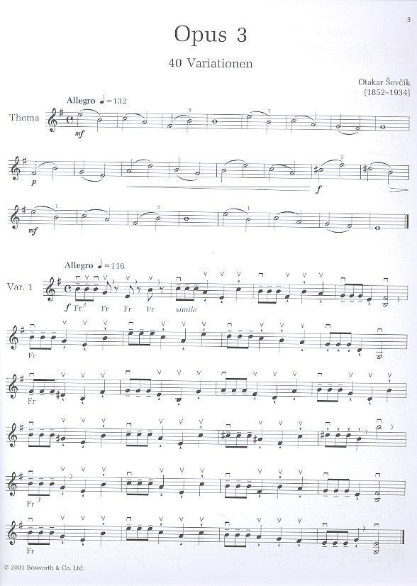 BOE3576 Violin Studies op.3 Otakar Sevick was a Czech musician and violin teacher who wrote many studies, methods and teaching tools. Many of which are still important today. For instance his violin methods are still useful a century later and his studiesremain second to none. This volume of 40 studies for right-hand technique includes exercises in string-crossing, arpeggios, triplets, changing bowing styles, staccato playing, legato playing and more.
