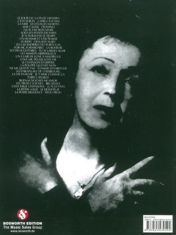 Replacement for PMV11127 / 9783954560325 /M-50011-086-6 40 chanson evergreens with German and English texts for piano and voice. The French texts are also included. The book contains pictures of well known French chanson artists. Am Tag als der Regen kam Ame caline Autumn Leaves Bitte geh nicht fort Bruxelles Buenas noches mi amor Capri c'est fini Cent mille chansons C'est si bon Comme d'habitude Das Glück kam zu mir wie ein Traum Das Meer Der Deserteur Der kleine Walzer Der Mond von Wanne-Eickel Der Schleier fiel von meinen Augen Die Wäscherin von Portugal Die weiße Hochzeitskutsche Domino Du lässt dich geh'n Du lässt es nie Einen Sommer lang Er sah aus wie ein Lord Es gibt nur ein Paris Es war nicht so gemeint For me formidable Freunde für's Leben Frou-frou Fuer mich Hätt ich einmal nur Zeit If i only had Time Je n'aurai pas le temps Je t'aime comme ca Je t'aime je t'aime Je t'aime moi non plus Komm Karline komm La Bohème La chanson d'Orphée La mer La petite diligence La petite valse La vie en rose La poupée qui fait non Le deserteur Le jour ou la pluie viendra Le plat pays Le rififi Les amants merveilleux Les deux guitares Les feuilles mortes Les lavandieres du Portugal Les parapluies de Cherbourg Les trois cloches Love me, please love me Manha de carnaval Mein flaches land Mein herz schlaegt daba daba dab Mein ideal Meine puppe sagt nein Meine liebesmelodie My way Ne me quitte pas Oh, lady mary Paris canaille Qu'il fait bon vivre Regenballade Rififi Schau mich bitte nicht so an So leb' dein leben So ist paris Soul coaxing Sous les ponts de paris Spiel zigeuner Tu te laisse aller Un clair de lune a maubeuge Un homme et une femme Viens poupoule Wenn die glocken hell erklingen While the angelus was ringing