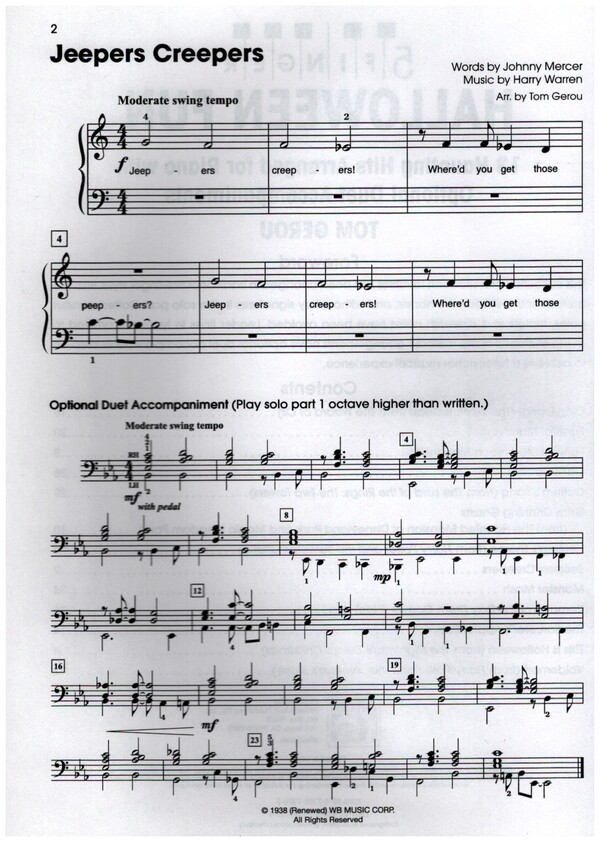 Gerou, Tom, arr. These haunting Halloween hits have been arranged in traditional five-finger style, with the melody split between the hands and without key signatures in the student part. Dotted quarter notes, triplets and sixteenth notes have been avoided. All of the melodic arrangements have optional duet accompaniments created to achieve a fuller, richer musical experience. Ding-Dong! The Witch Is Dead (The Wizard of Oz) Funeral March Funeral March of a Marionette Gollum's Song (The Lord of the Rings) Ghostbusters Grim Grinning Ghosts (The Haunted Mansion at Disneyland Park and Magic Kingdom Park) Hedwig's Theme (Harry Potter) Jeepers Creepers Monster Mash Remains of the Day (Corpse Bride) This Is Halloween (The Nightmare Before Christmas) Voldemort (Harry Potter) The Sorcerer's Apprentice