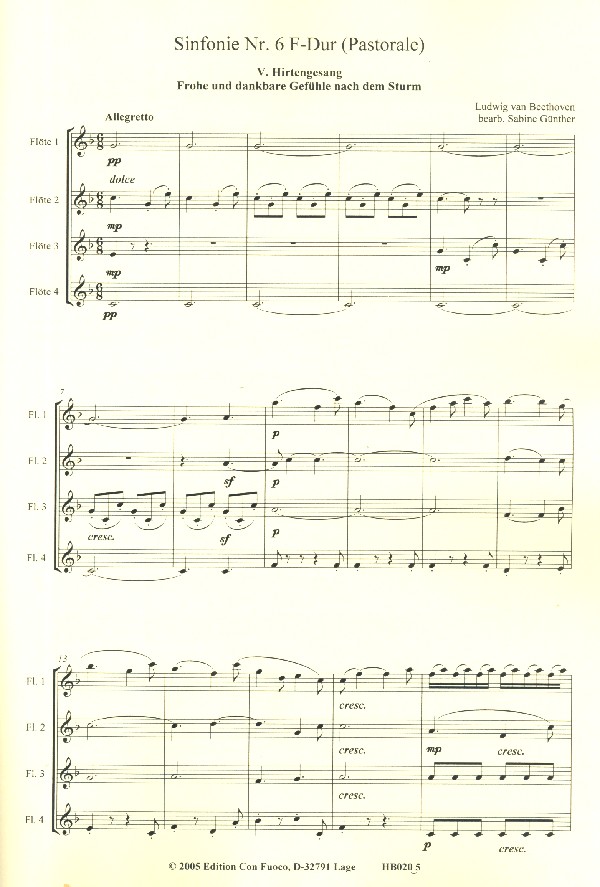 Günther, Sabine, Bearb. Hirtengesang Frohe und dankbare Gefühle nach dem Sturm Beethovens Pastoralsinfonie ist tönende Natur, was die Titel der einzelnen Sätze programmatisch widerspiegeln wie im 5. Satz 'Hirtengesang: Frohe und dankbare Gefühle nach dem Sturm'. Das Arrangement führt auf ideale Weise in Beethovens pastorale Klangwelt ein.