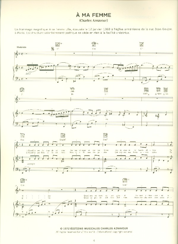 avec photos À ma femme À ma fille Ave Maria Bon anniversaire Comme ils disent Désormais Emmenez-moi Et moi dans mon coin Et pourtant Être For me formidable Hier encore Il faut savoir Ils sont tombés J'aime Paris au mois de mai J'en déduis que je t aime Je bois Je m'voyais déjà Je n'ai pas vu le temps passer Je n oublierai jamais L amour c est comme un jour L amour et la guerre La bohème La Mamma Le cabotin Le temps Les comédiens Les deux guitares Les jours Les plaisirs démodés Mes emmerdes Mourir d'aimer Non je n'ai rien oublié Nous nous reverrons un jour ou l'autre Parce que Paris au mois d août Plus bleu que tes yeux Pour essayer de faire Une chanson Pour faire une jam Pour toi Arménie Que c est triste Venise Qui Reste Sa jeunesse Sur ma vie Toi et moi Tous les visages de l amour (She) Tout s'en va Trousse-chemise Tu te laisses aller Va Viens au creux de mon épaule Bookmakers International - Patrick Moulou