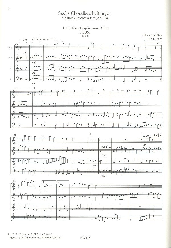 Flautando Edition Miehling, Klaus, arr. Eine feste Burg ist unser Gott Aus tiefer Not schrei ich zu dir Verlieh uns Frieden gnädiglich Erhalt uns Herr nach deinem Wort Vater unser im Himmelsreich Nun freut euch lieben Christen g'mein