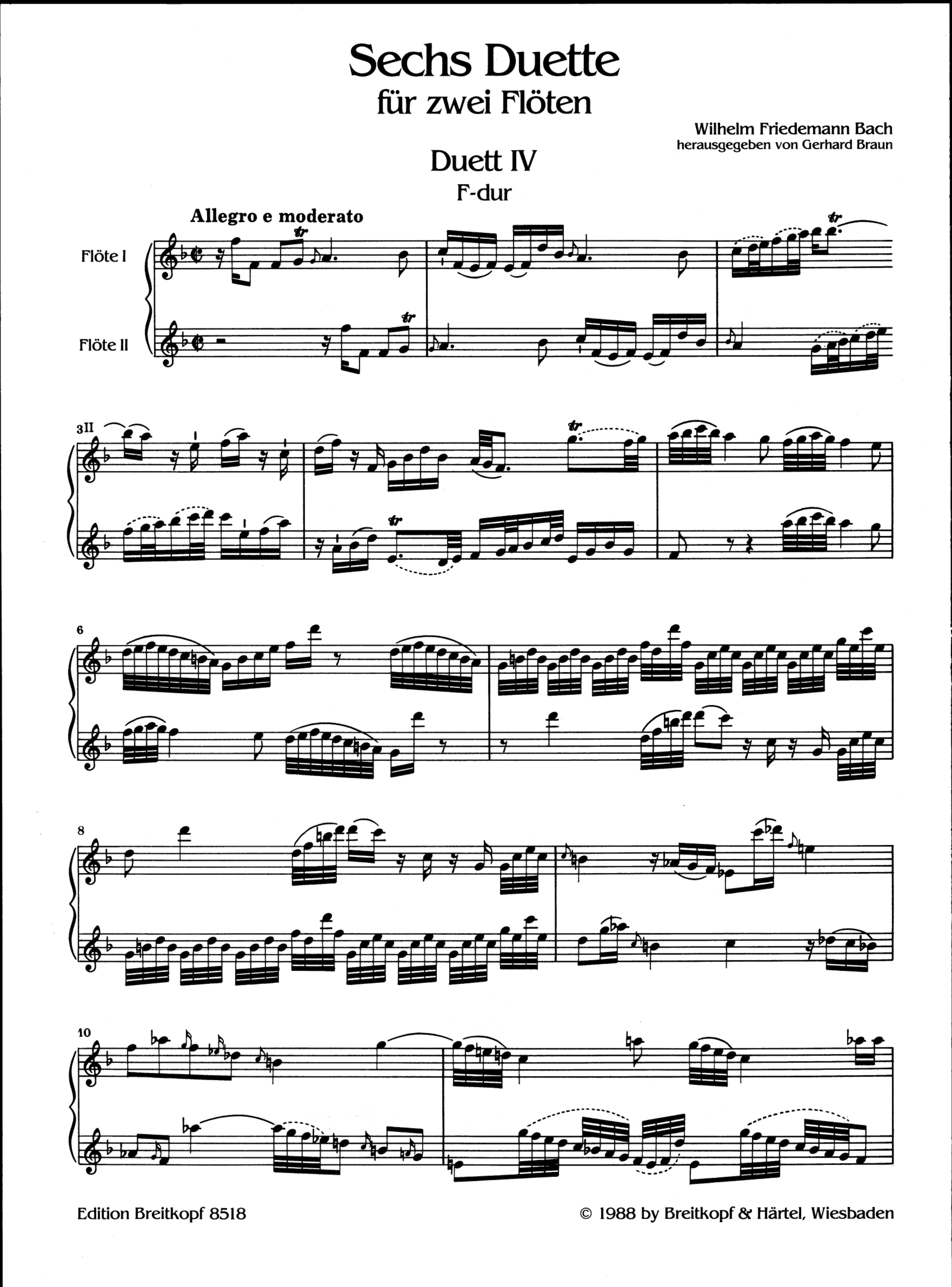 BRAUN, GERHARD, ED Die sechs Duette für zwei Flöten von Wilhelm Friedemann Bach zählen zu den bedeutenden Werken dieser zumeist pädagogisch orientierten Literaturgattung. Darüber hinaus dokumentieren sie auf eindrucksvolle Weise das Ende des Barockzeitalters. Als Quelle der vorliegenden Ausgabe diente eine ältere Abschrift aus Johann Philipp Kirnbergers Besitz mit der Titelangabe Sechs Sonaten für 2 fleutten von Friedemann Bach. Die Duette Nr. 5 und 6 sind darin von anderer Kopistenhand nachgetragen.