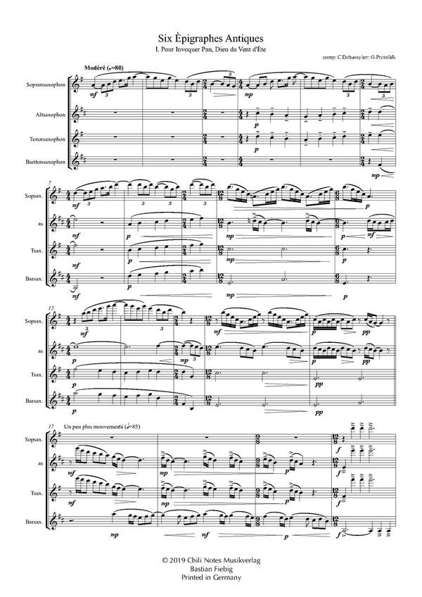 | Untertitel: | für 4 Saxophone (SATBar) Partitur und Stimmen |