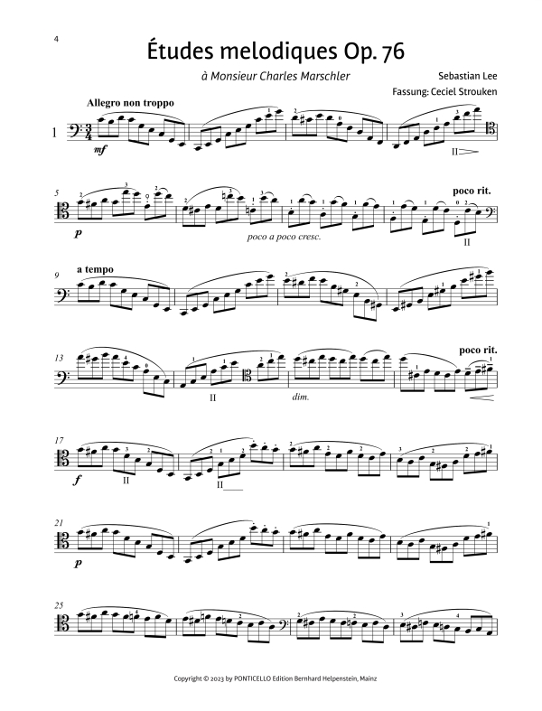 Aus dem umfangreichen Schaffen Sebastian Lees (1805?1887) mit 131 gedruckten Opera haben sich nur noch wenige Werke in Unterricht und Konzert erhalten. Viele Werke aber sind seit Jahren nicht mehr erhältlich, und das ist bedauerlich. Denn Lees Etüden und Konzertstücke sind nicht nur pädagogisch wertvoll, sondern auch reich an melodischen Einfällen und eignen sich sowohl für das Studium als auch für den Konzertsaal. Um diesen Schatz zu erschließen, hat sich die Herausgeberin Ceciel Strouken zu einer Neuausgabe eines Teils seiner Werke entschlossen. Dabei legt sie jede Etüde in zwei Fassungen vor: einmal in einer von ihr für die gegenwärtige Spielpraxis eingerichteten Version und einmal in der Originalgestalt. Als Grundlage für die Neuausgabe der 6 Études mélodique pour Violoncelle seule op. 76 diente der 1854 bei Colombier in Paris erschienene Erstdruck. Die Notation wurde der heute üblichen angeglichen, wenige Fehler wurden stillschweigend korrigiert. Auch wenn sie selbst die von ihr eingerichtete Fassung in Unterricht und Konzert verwendet, hat die ursprüngliche weiterhin einen wichtigen Zweck. Vermittelt sie doch einen Einblick in die Spielpraxis in der Mitte des 19. Jahrhunderts.