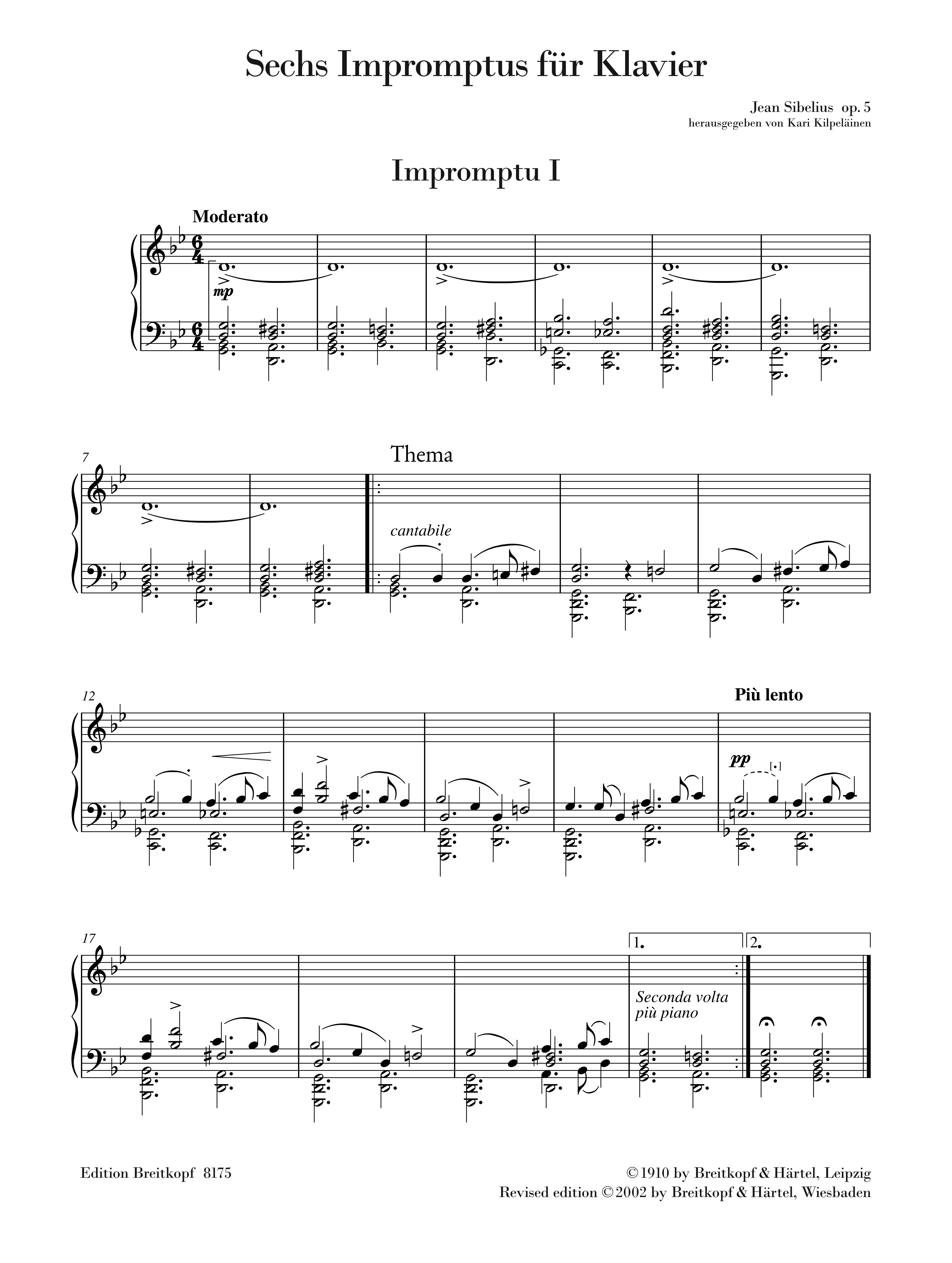 Kilpiläinen, Kari, ed Klavierwerke durchziehen das ganze Schaffen von Jean Sibelius. Nach ersten Studienwerken entstanden 1893 die Sonate op. 12 (EB 8142) und der erste Zyklus, die Sechs Impromptus op. 5. Hier knüpft der finnische Komponist selbstbewusst an die große, durch Schubert und Chopin geprägte romantische Klaviergattung an. Kompositorisch greift Sibelius dabei teilweise auf Jugendwerke zurück. Andererseits benutzt er die beiden letzten Stücke aus op. 5 als Ausgangsmaterial, wenn er sie kurz nach ihrer Entstehung zu einem eigenständigen Impromptu für Streichorchester zusammenfügt. Wie viel Bedeutung kann nach dieser Grenzüberschreitung dem bekannten Sibelius-Zitat beigemessen werden: Ihr müsst mich nach meinen Orchesterwerken beurteilen. Das Klavier interessiert mich nicht. Es kann nicht singen? Pianisten wie Ralf Gothoni, Glenn Gould und Olli Mustonen haben sich durch die harsche Selbstkritik des Komponisten nicht schrecken lassen und mit ihren Interpretationen überzeugende Gegenbeweise geliefert.