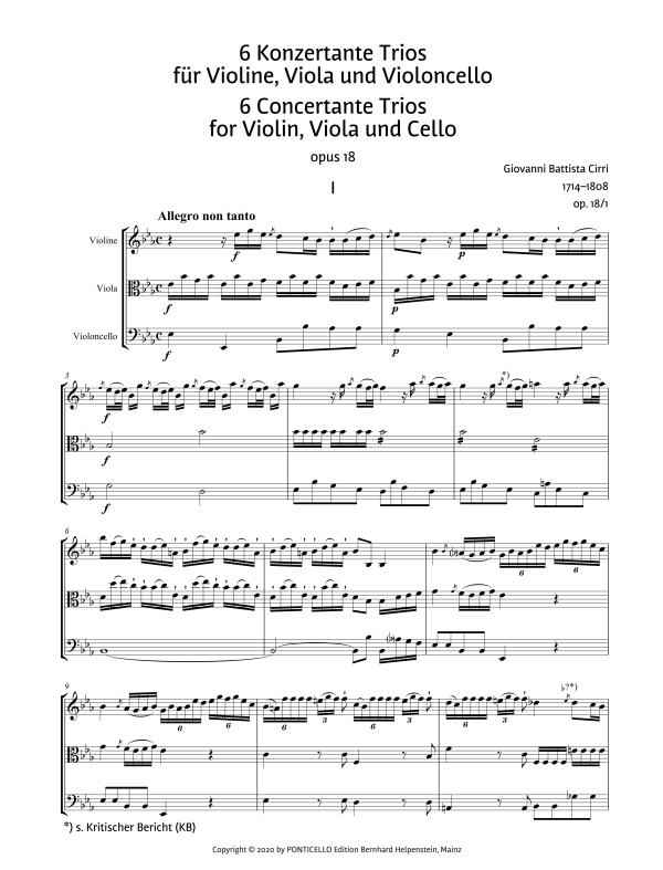 Giovanni Battista (Giambattista) Cirri (1724-1808) ist durch seine drei leichten Sonaten vor allem den CellistInnen ein Begriff. Das Besondere an seinen konzertanten Trios ist, dass nicht nur - wie so oft! - die Violine konzertieren darf, sondern gelegentlich auch die Viola und vor allem das Violoncello. Eine Herausforderung für das Cello und eine wirkliche Repertoire-Bereicherung!