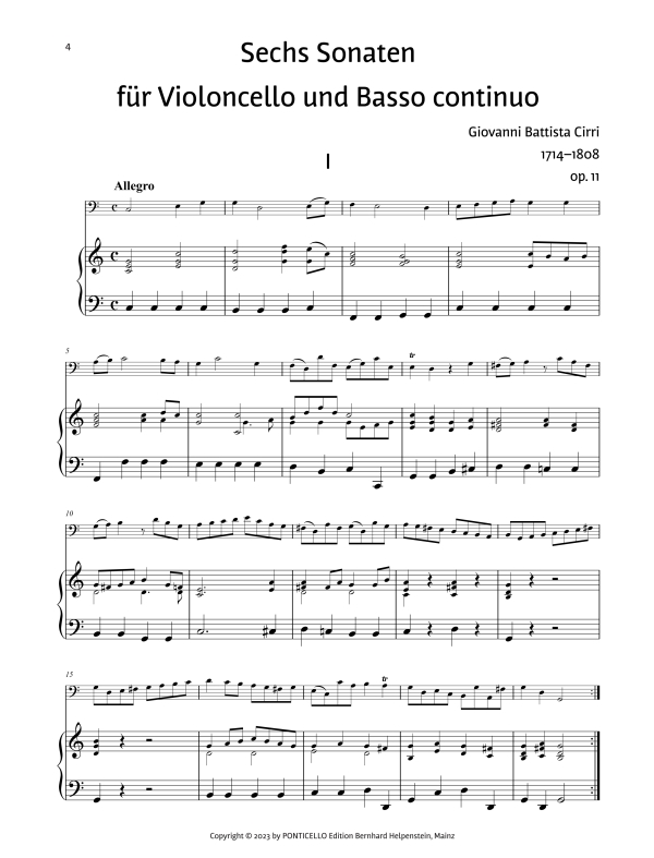 Cirris Sonaten opus 11 für Violoncello und Bass waren bislang nur zum Teil in modernen Ausgaben erhältlich: Hier wird nun die komplette Sammlung mit ihren sechs Sonaten vorgelegt. Der Komponist, der Music Master to his Royal Highness The Duke of Gloucester, hat sie ausdrücklich als leichte Stücke im unterhaltsamen Stil für junge Cello-Spieler/Spielerinnen gedacht: ?In an easy Pleasing Taste proper for Young Practitioners on that Instrument?, wie das Titelblatt vermerkt. Im Original ist die Solostimme mit untergelegter ? unbezifferter ? Continuo-Stimme abgedruckt. In dieser Edition wurde eine einfache Klavierbegleitung hinzugefügt. Die Sonaten können aber durchaus auch als Duo mit zwei Violoncelli aufgeführt werden, diese Möglichkeit wird durch die Anlage als Spielpartitur erleichtert. Alle sechs bieten eingängige, gut klingende Musik und sind für junge Cellisten/Cellistinnen dankbare Stücke, die zu spielen (und zu hören) Spaß machen ? ideal für Unterricht, häusliches Musizieren und konzertante Aufführungen sowie als Beitrag für Jugend musiziert.