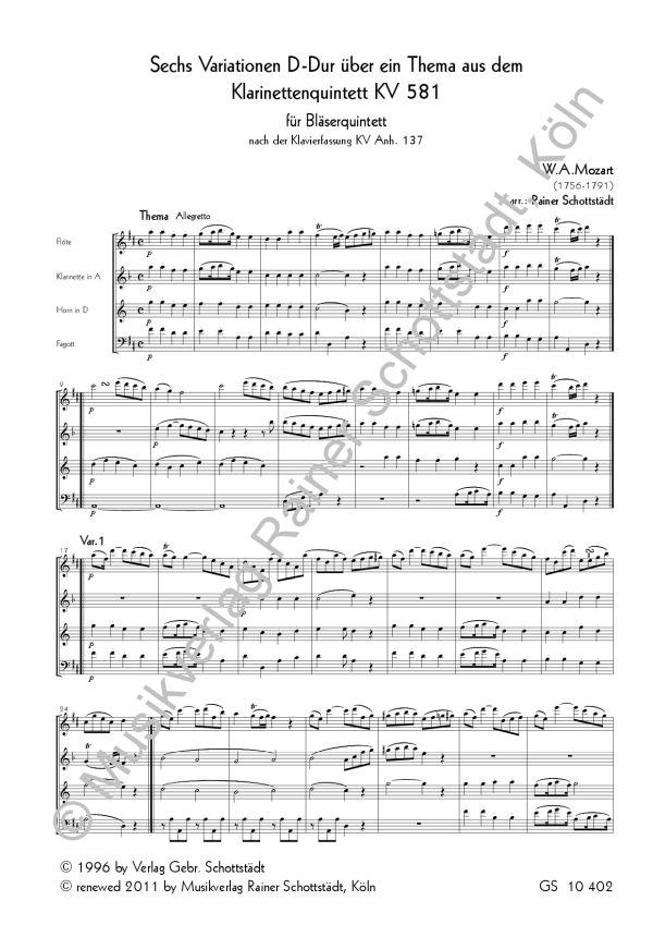 Klarinettenquintett KV581 nach der Klavierfassung KVAnh.137 Schottstädt, Rainer, bearb.