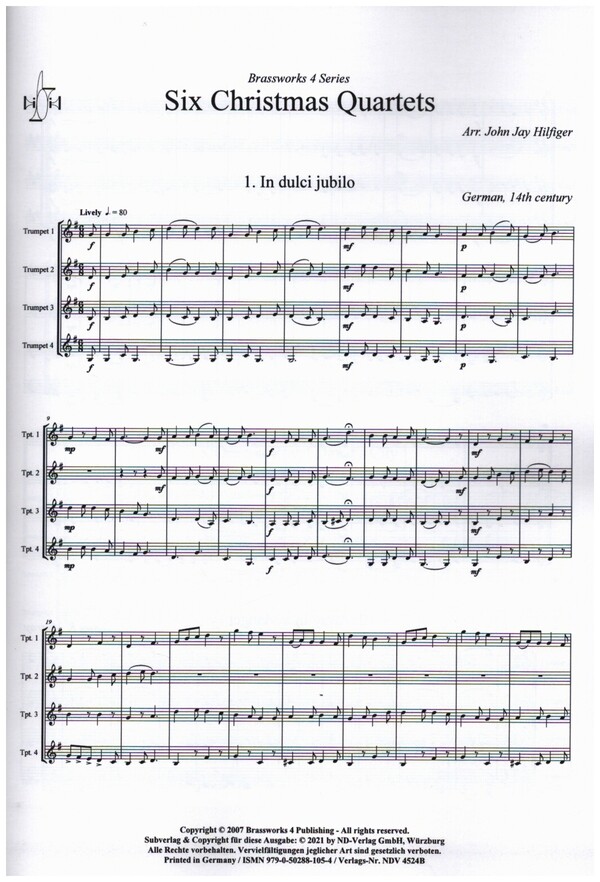Hilfiger, John Jay, arr. 1. In dulci jubilo (14.Jahrhundert) - Lebhaft 2. Away in a Manger (James R. Murray) - Andante 3. Once in Royal David's City (Henry J. Gauntlett) - Moderato 4. Bring a Torch, Jeanette, Isabella (Französisches Weihnachtslied) - Lebhaft 5. Angels We Have Heard on High (Französisches Weihnachtslied) - Moderato 6. Joy to the World (Lowell Mason) - Freudenvoll