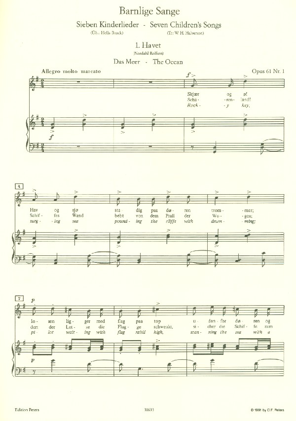 Op.61 Children's songs Barnlige sange Das Meer Der Weihnachtsbaum Lockweise Fischerweise Abendlied für den Falben Die norwegischen Berge Psalm für das Vaterland Brock, Hella, dt. Übersetzung
