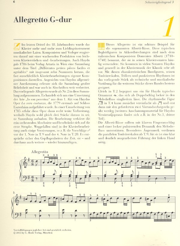 Reihe Am Klavier Hewig-Tröscher, Sylvia, ed und Fingersatz Allegretto nach Arie aus a vera costanza Allegretto nach Hob. III:41IV Largo assai in E nach Hob. III:74II Poco adagio in G - nach den Variationen über Gott erhalte Hob. III:77II Moderato - Allegretto aus Sonate g-moll Hob. XVI:44 Klaviersonate D-dur Hob. XVI:37 1. Satz: Presto aus Sonate e-Moll Hob. XVI:34 3. Satz: Finale. Tempo di Minuet aus Sonate Hob. XVI:49