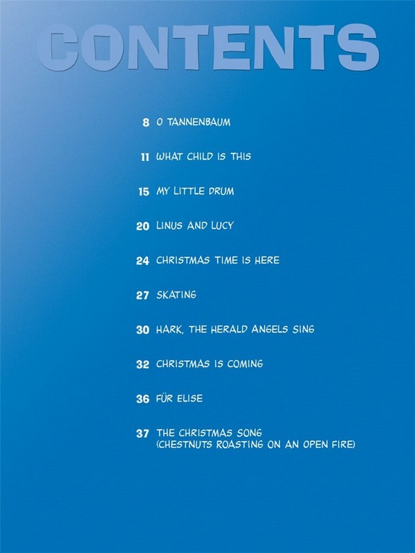 O Tannenbaum What Child is this My little Drum Linus and Lucy Christmas Time is here Skating Hark, the Herald Angels sing Christmas is coming Für Elise The Christmas Song (Chestnuts roasting on an open Fire)