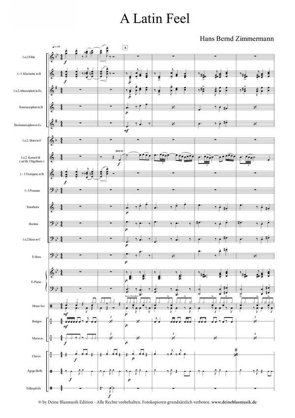 Inspiriert durch die Anfrage eines Freundes, ein Werk für einen lateinamerikanischen Themenabend zu komponieren, setzte sich der Komponist und Dirigent Hans Bernd Zimmermann mit der Stilistik auseinander. In 'A Latin Feel' verschmelzen die Ideen des Autoren mit südamerikanischen und karibischen Stilelementen. Beginnend mit einem lyrischen Flügelhorn/Kornett-Solo baut sich das Werk langsam auf und zündet ein musikalisches Feuerwerk im Latin-Stil.