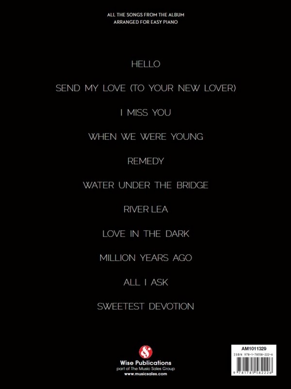 Hello Send my Love (To your new Lover) I miss You When we were young Remedy Water under the Bridge River Lea Love in the Dark Million Years ago All I ask Sweetest Devotion