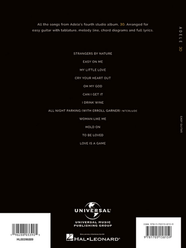 All the songs from Adeles fourth studio album, 30. Arranged for easy guitar with tablature, melody line, chord diagrams and full lyrics. 1. Strangers By Nature 2. Easy On Me 3. My Little Love 4. Cry Your Heart Out 5. Oh My God 6. Can I Get It 7. I Drink Wine 8. All Night Parking (Interlude) 9. Woman Like Me 10. Hold On 11. To Be Loved 12. Love Is a Game