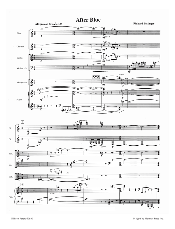 After Blue was commissioned by the Paul Fromm Music Foundation at Harvard University for the New Millennium Ensemble. Richard Festinger uses the sextet?s diverse instrumentation to create ?a kaleidoscopic panorama of strongly etched lines of constantly shifting vibrant color.? The first and last sections of the 16-minute work are thematically related and ?bright and extroverted,? while the centerpiece becomes ?dramatic and atmospheric.? After Blue is a companion to an earlier work by Festinger, A Serenade for Six.