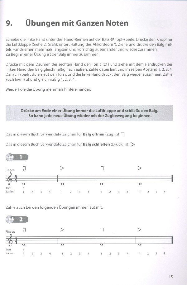 Musiktheorie, Spielstücke und Übungen Haltung und Balgführung